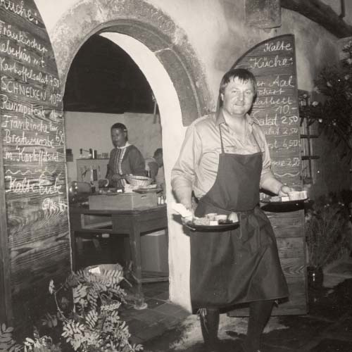 An Pfingsten 1982 stand der Innenhof voller Tische und Stühle; der Innenbereich der Gebäude war noch immer eine einzige staubige Baustelle. Kein Schild hing an der Aussenwand, und für Werbung war kein Geld da gewesen. Thomas Höreth öffnete mit klopfendem Herzen das schmiedeeiserne Tor gegen Mittag – und die ersten Gäste kamen herein.